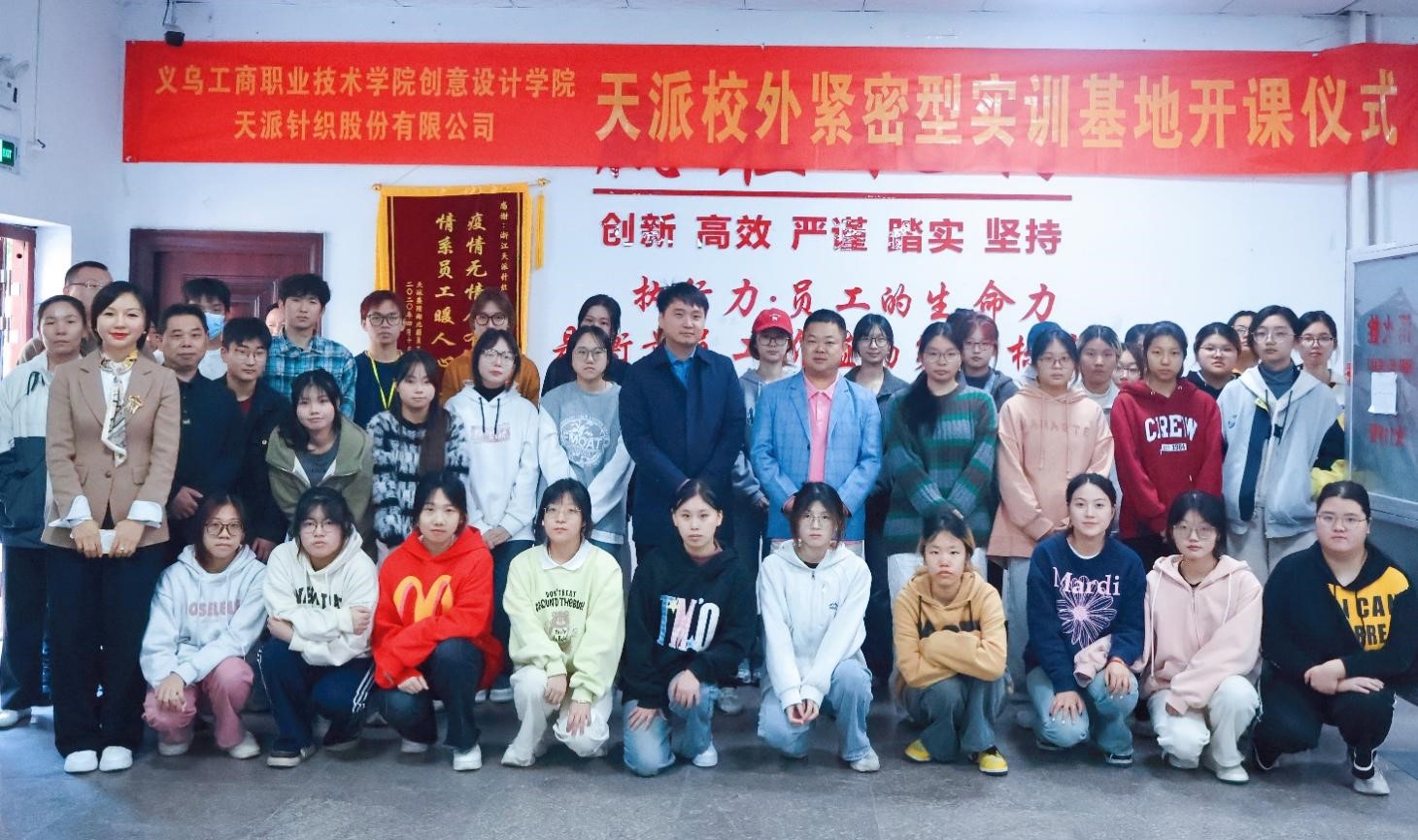 義烏工商職業(yè)技術(shù)學(xué)院服裝與服飾設(shè)計專業(yè)基于“工學(xué)商用”一體化區(qū)域特色學(xué)徒人才培養(yǎng)模式,通過將課堂設(shè)在崗位里,將崗位引入課程里,實現(xiàn)課程與區(qū)域產(chǎn)業(yè)經(jīng)濟發(fā)展的緊密結(jié)合。專業(yè)與行業(yè)龍頭企業(yè)天派針織股份有限公司共同建立無縫針織產(chǎn)教融合實訓(xùn)基地(中心),基地面積約為1000平方米,企業(yè)投入建設(shè)經(jīng)費1000萬元,實訓(xùn)工位248個,為學(xué)生的實踐教學(xué)提供了優(yōu)質(zhì)的場所和實訓(xùn)實習條件;同時,為學(xué)生提供可以接觸到最前沿的無縫針織技術(shù)和最真實的無縫針織智能應(yīng)用場景的平臺,真正為學(xué)生搭建了“工學(xué)結(jié)合”的實訓(xùn)基地。基地自2023年9月以來,校企聯(lián)合開設(shè)《無縫針織技術(shù)》《智能制造系統(tǒng)應(yīng)用》等6門崗位核心課程,總課時量達360學(xué)時。